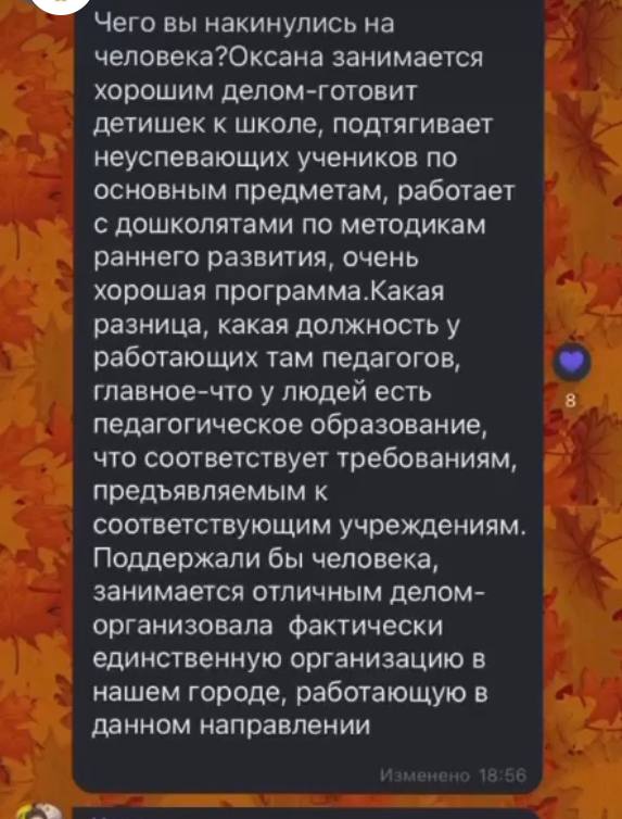 Оксана занимается очень хорошим делом - готовит детишек к школе, подтягивает отстающих по школьным предметам, работает с малышами по программам раннего развития. Кстати, я знаю, что программы Оксана тоже пишет сама. И программы у них очень хорошие. Оксана организовала единственную организацию, которая занимается с детьми, в нашем городке. Молодец! Спасибо!